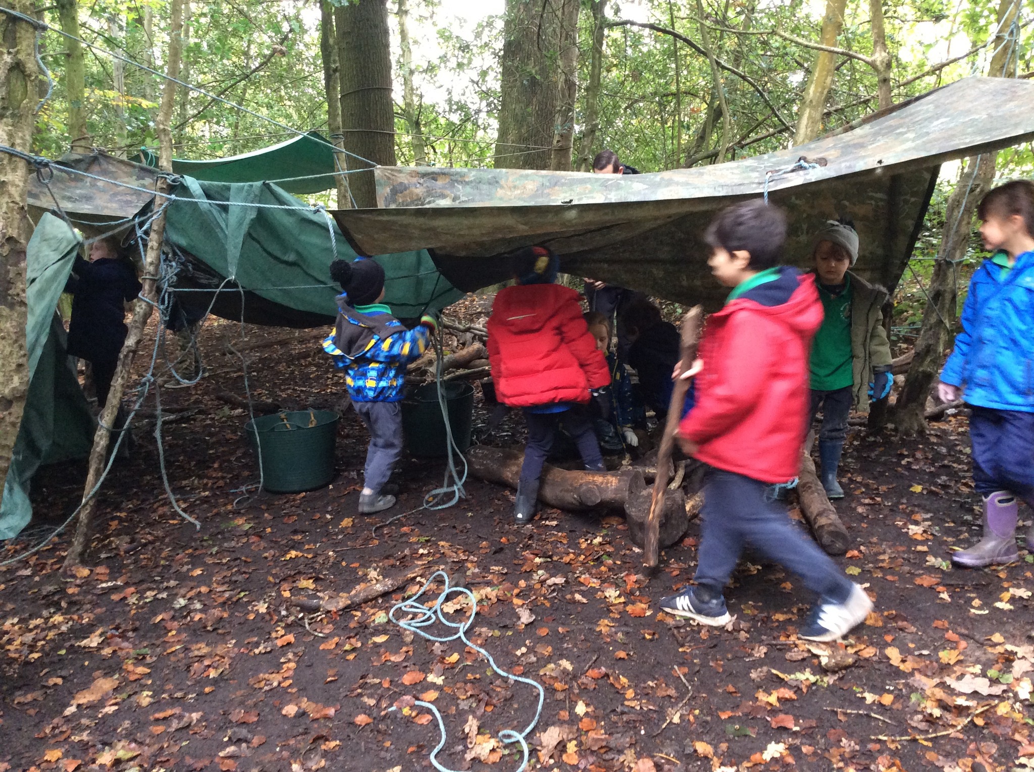 Guided by the instructor, the children build an epic woodland den using tarps, ropes and sticks to protect themselves from the impending “storm”. Once the storm has passed its time to put the kettle on around the campfire and enjoy hot chocolate with toasting marshmallows.