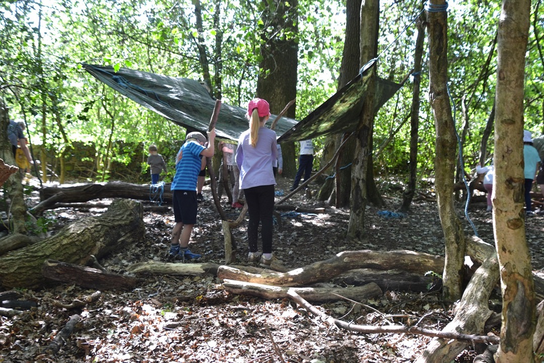 - Shelter Building: Working as a team, children build a woodland shelter using tarps, ropes and sticks to protect themselves from the incoming “storm”.